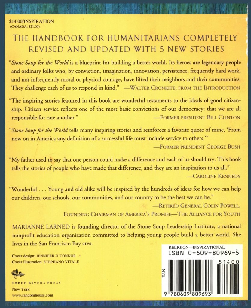 The dramatic and heartening stories in Stone Soup for the World immediately immerse readers in other cultures and countries, and engage them in the struggles of real heroes who fight battles against violence, disease and hunger within their individual lives, their communities and nations. The Curriculum provides stimulating questions for students, values and qualities exemplified in the stories, lessons gleaned from the narratives, activities for language arts and social studies classes, and project ideas for community service. The self-paced curriculum emphasizes improving young people’s reading and higher-order thinking skills, ensures that the Stone Soup selections can support discussions on global interdependence, cross-cultural issues, cultural and ethnic diversity, conflict management, and universal human rights. Through the narratives of these individuals’ intimate struggles and final successes, the young reader takes away a vision of victory and, hence, a greater willingness to engage the struggles in life. For, if these real people in their real stories can live such vibrant lives, accomplish so much, and in the end prevail, could not the young reader find comparable courage to face the inevitable challenges in his life? If Stone Soup can accomplish that feat, even for only one young mind, it would truly have been worth its place in our classroom.